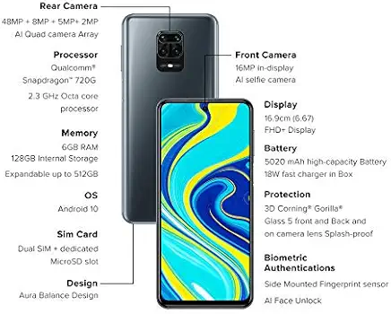 The 16.9cm(6.67") large display with rounded corner design and dot notch display. Qualcomm Snapdragon 720G octa-core processor with 8nm technology; coupled with MIUI 11 system level optimisations enables low power consumption for a longer battery life. 48MP Quad camera with high resolution camera. Capture great photos in different lighting conditions. Gorgeous portraits with automatically enhanced facial features. Support Ultra-wide and super macro mode. 5020 large mAh large battery with 18W fast charger in-box.